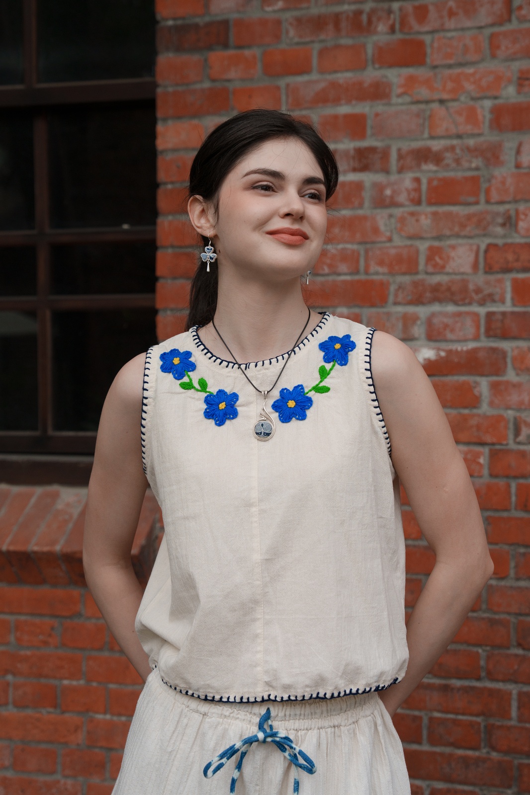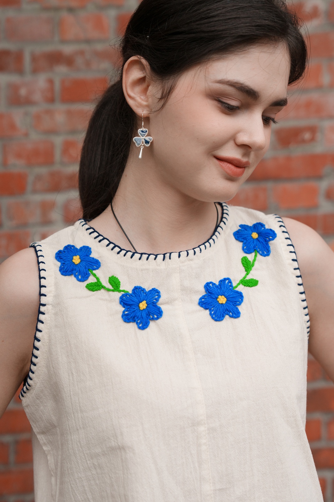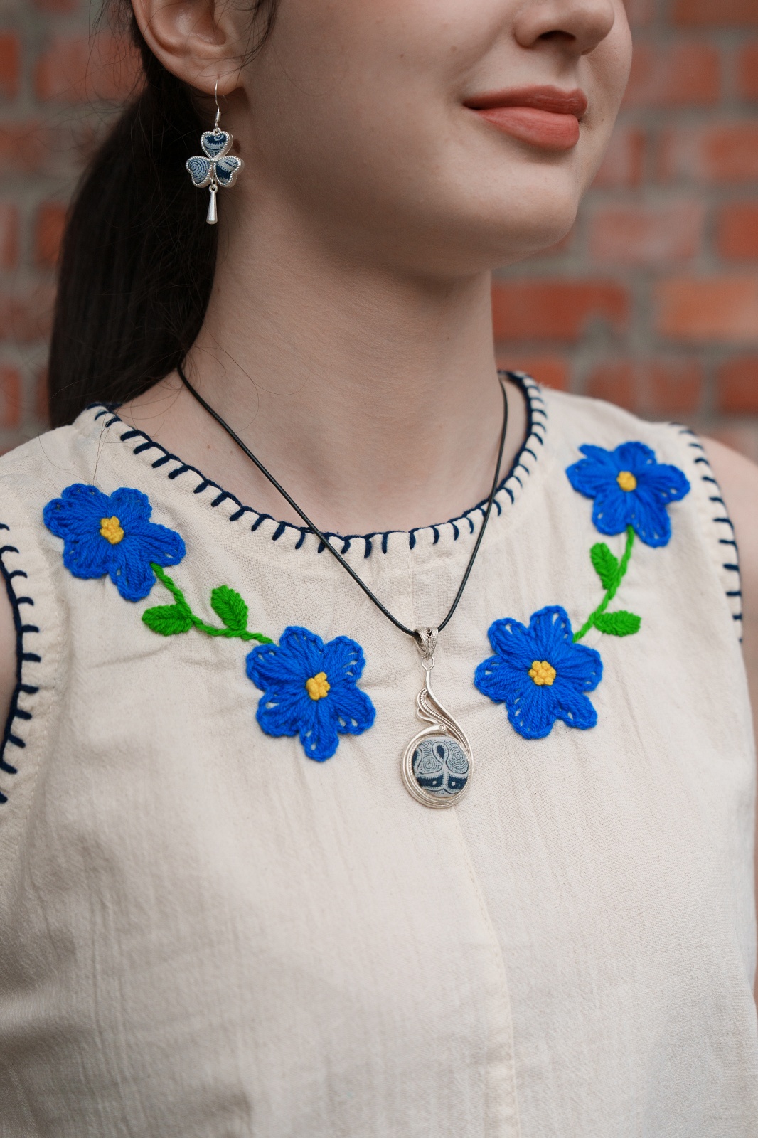 將藍染布鑲在銀子中,打造出可愛俏麗的耳環,也可以做藍染墜子,