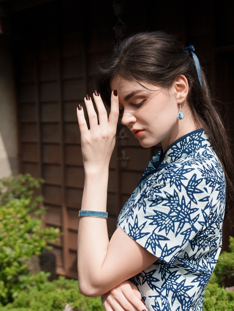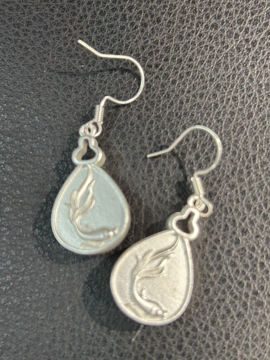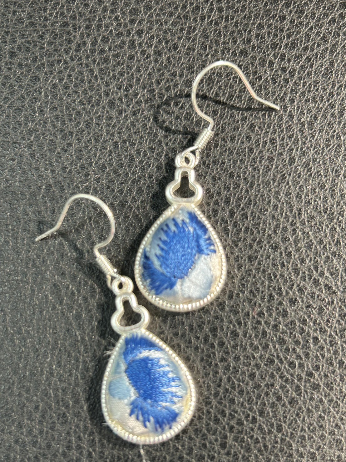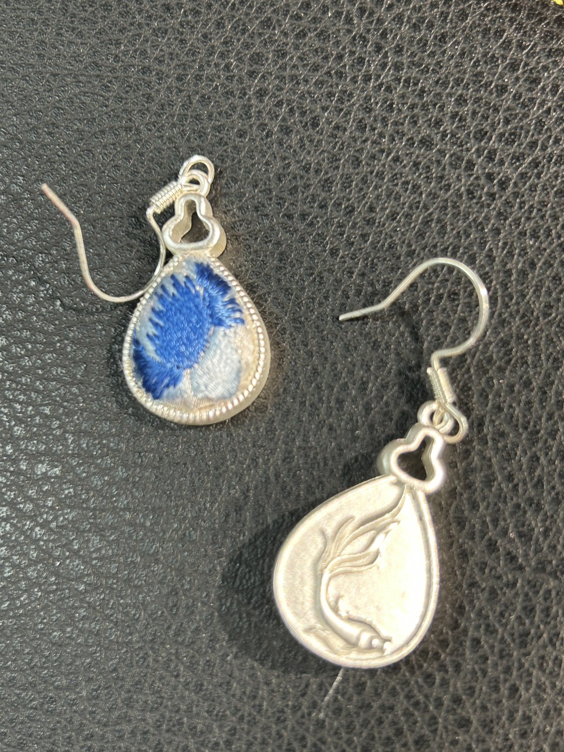 將繡花布鑲在銀子中,打造出可愛俏麗的耳環,也可以做藍染墜子,