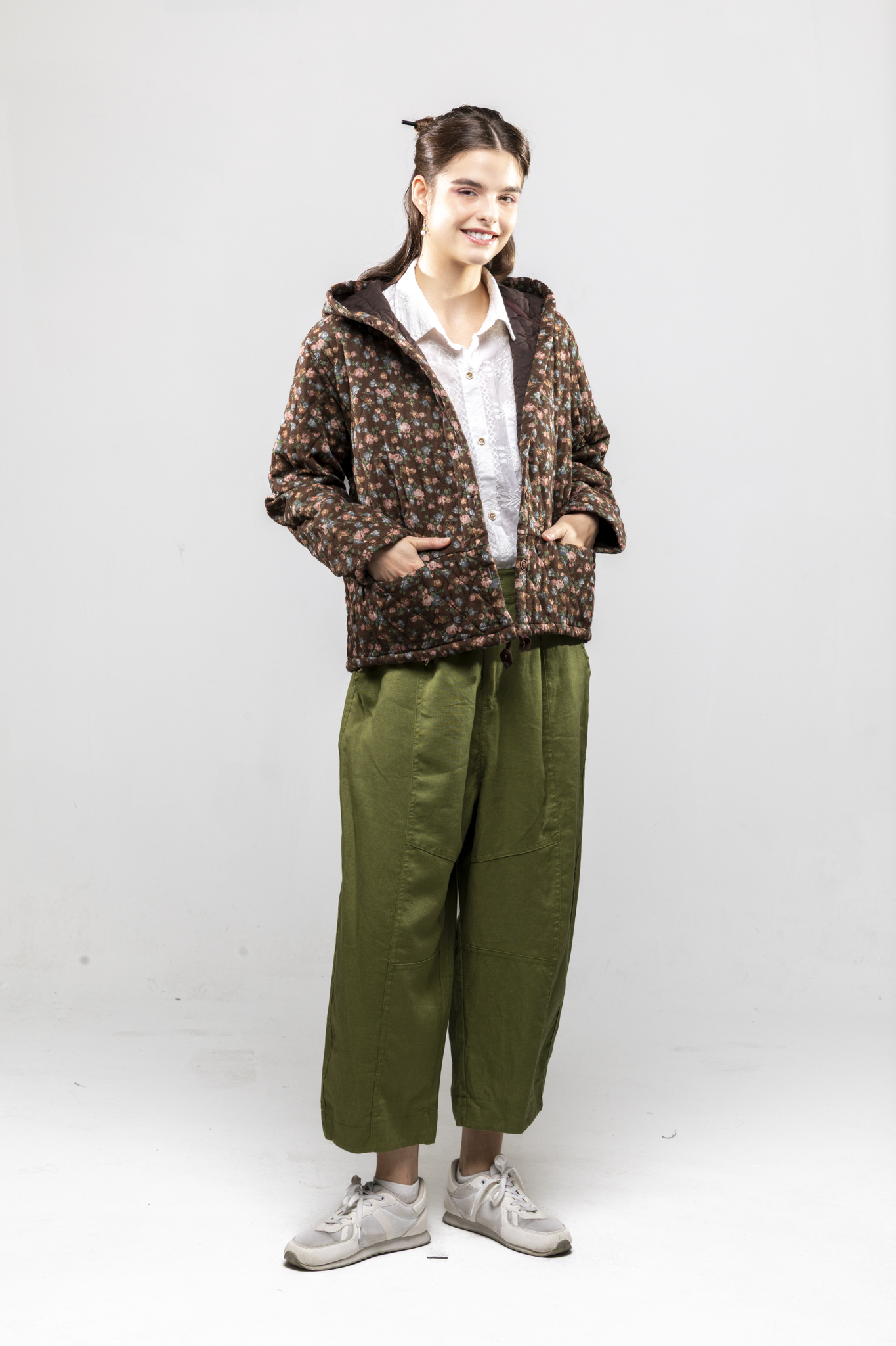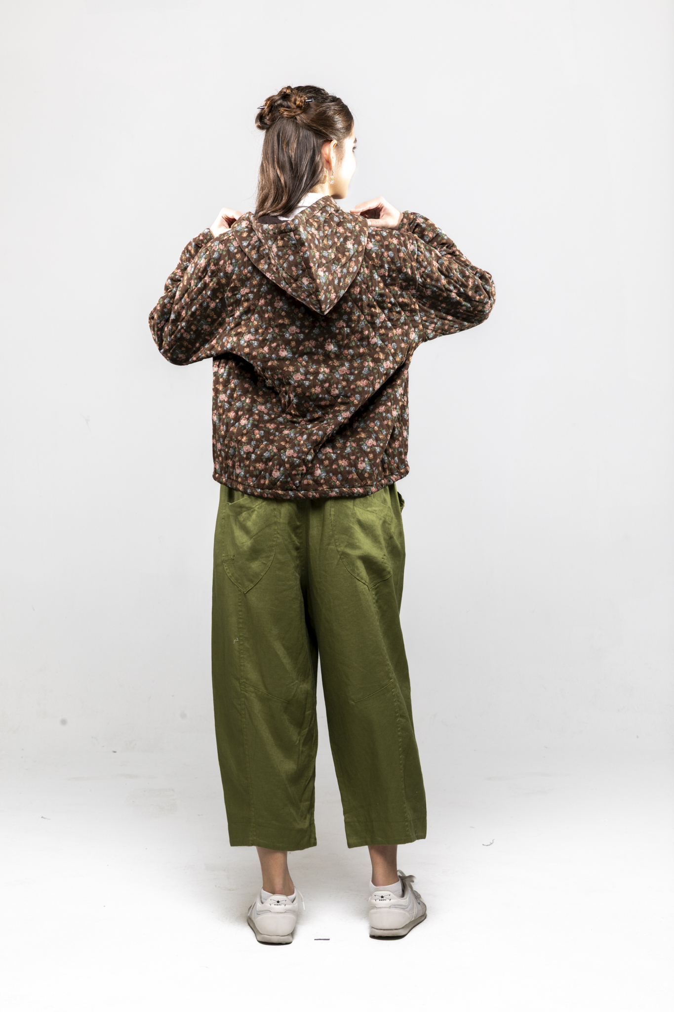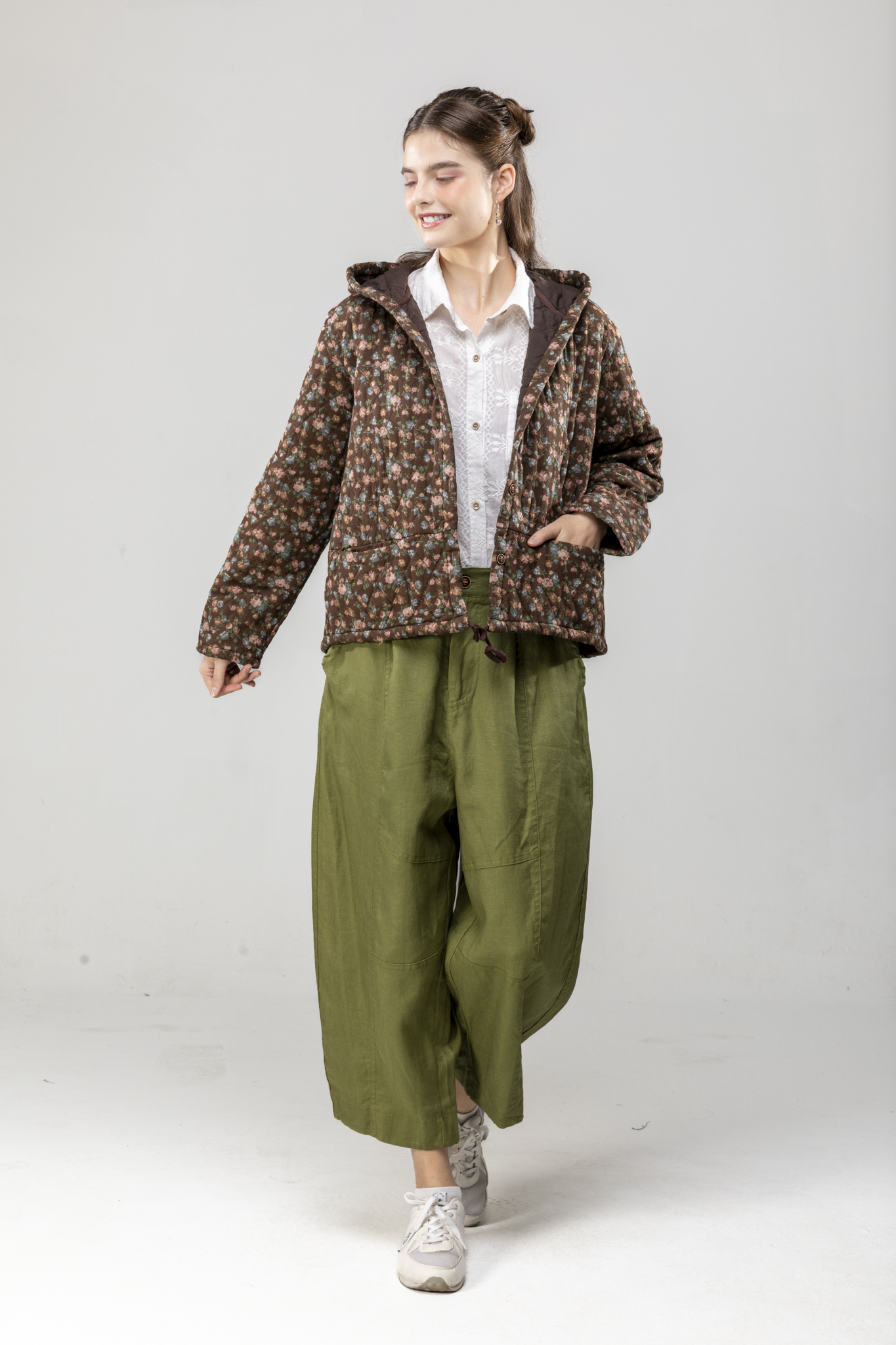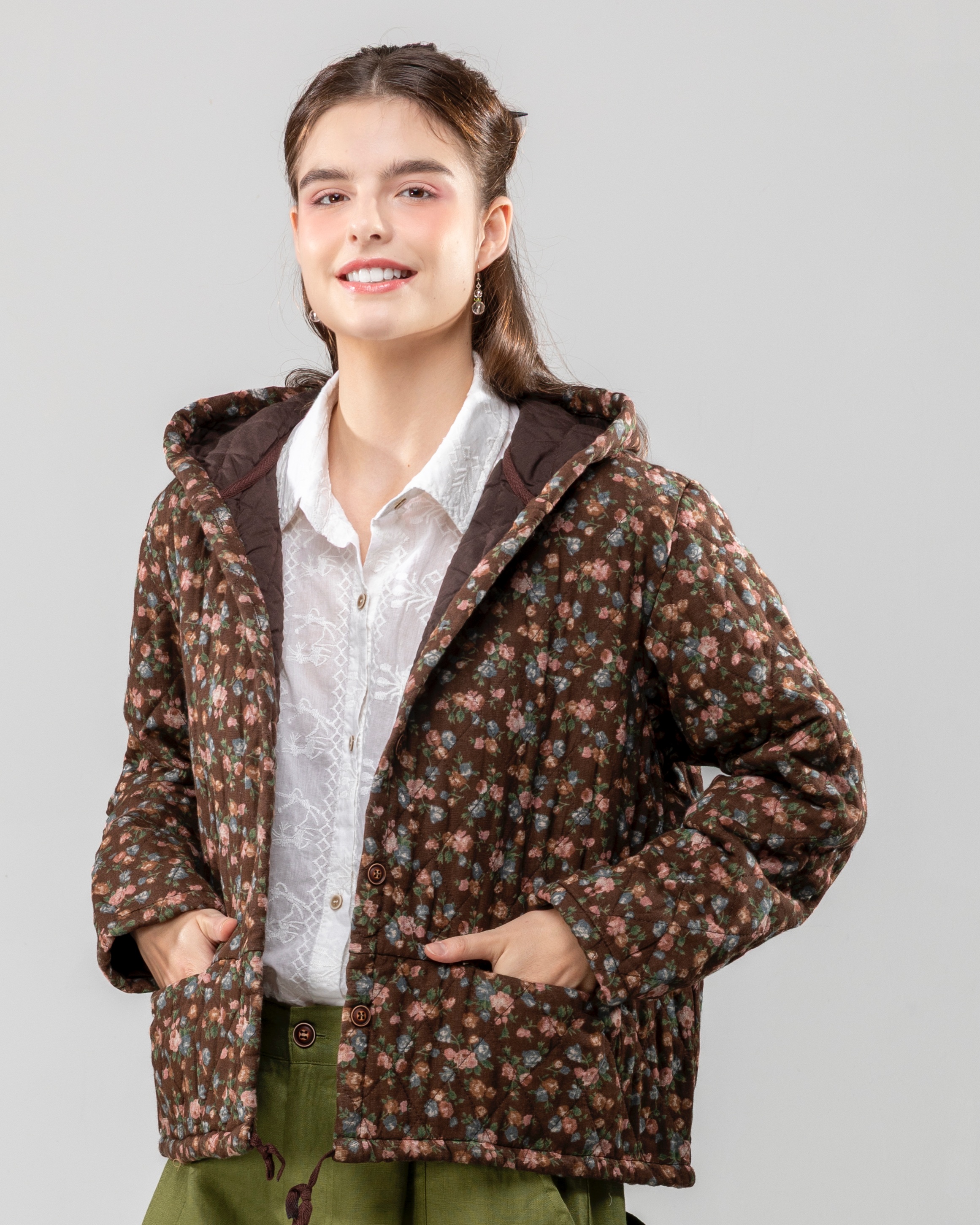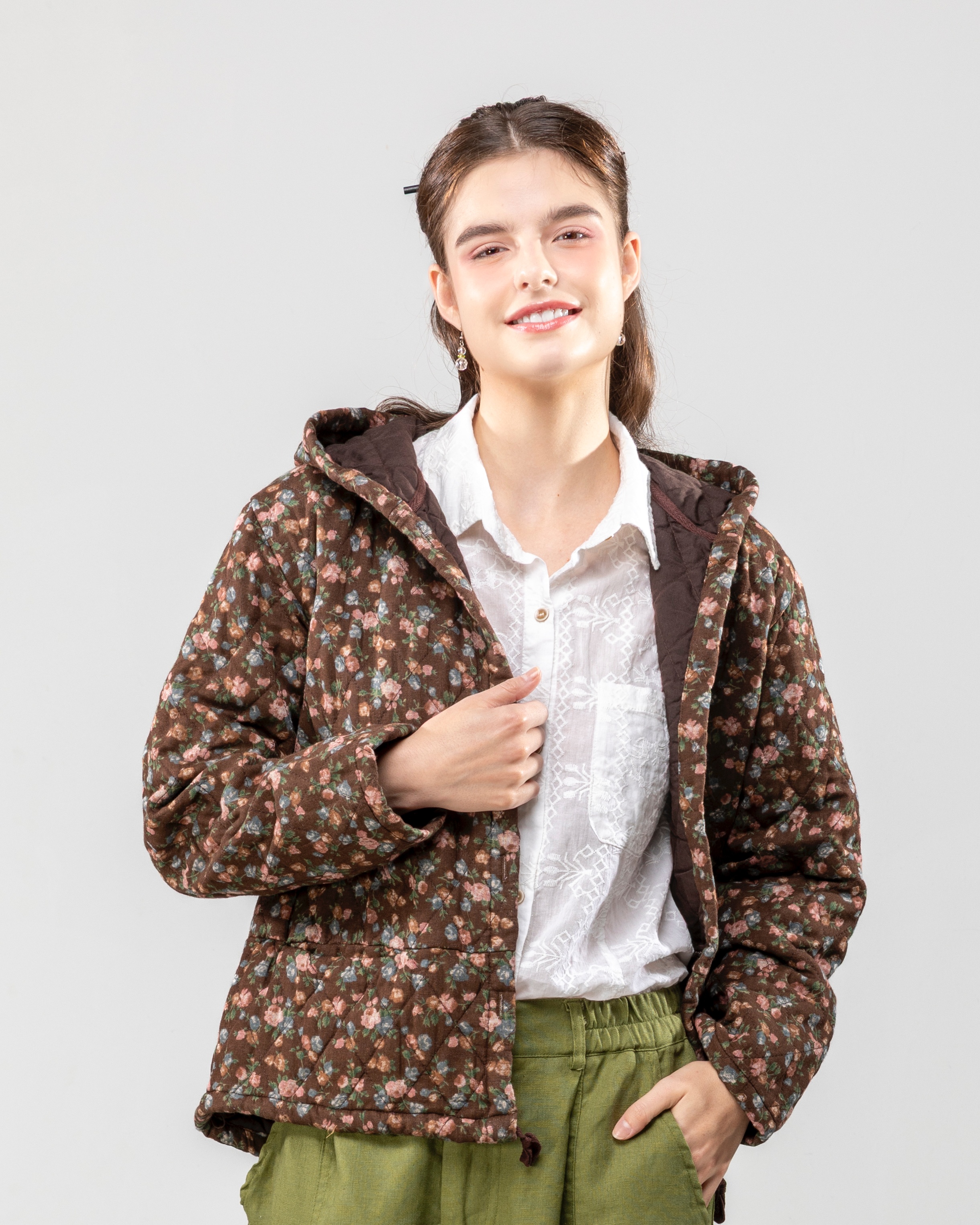 棕小花帶帽棉外套/棉衣